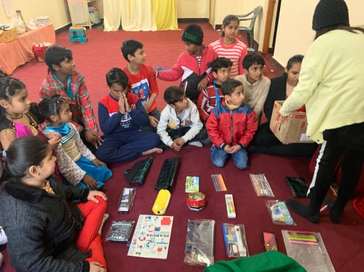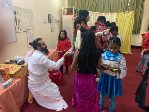 First, Jyothiji, the brahmachari, chanted mantras, sang bhajans and told stories. The children naturally followed his chanting and singing without any instruction. After that, it was just like any other party. They noisily enjoyed the cake, samosas, raffle, and gifts sent from Japan. After the party, one of my friends asked one of the children, “How was it? The girl replied, “I liked chanting Om.”